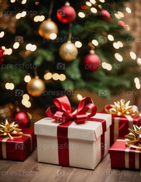 Обернутые в различные цвета подарки сидят под украшенной елкой, украшенной мерцающими рождественскими украшениями, создавая веселую и праздничную атмосферу для празднования Нового года
