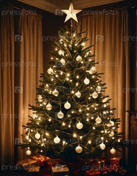Обернутые в различные цвета подарки сидят под украшенной елкой, украшенной мерцающими рождественскими украшениями, создавая веселую и праздничную атмосферу для празднования Нового года