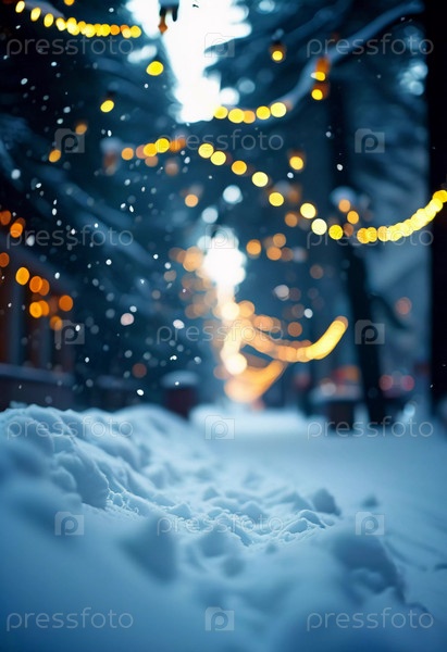 Зима приносит мягкий снегопад на городские улицы, где над головой висят красочные огни, создавая теплую и праздничную атмосферу. Эффект боке от огней добавляет причудливого прикосновения, подчеркивая радость сезона