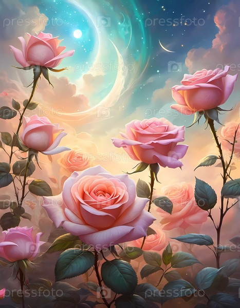 Потрясающая романтическая картина с изящными розовыми и персиковыми розами, цветущими под мягким небесным небом, с сияющим закатом, освещающим сцену. Луна и звезды, вызывающие чувство безмятежности и любви. ИИ