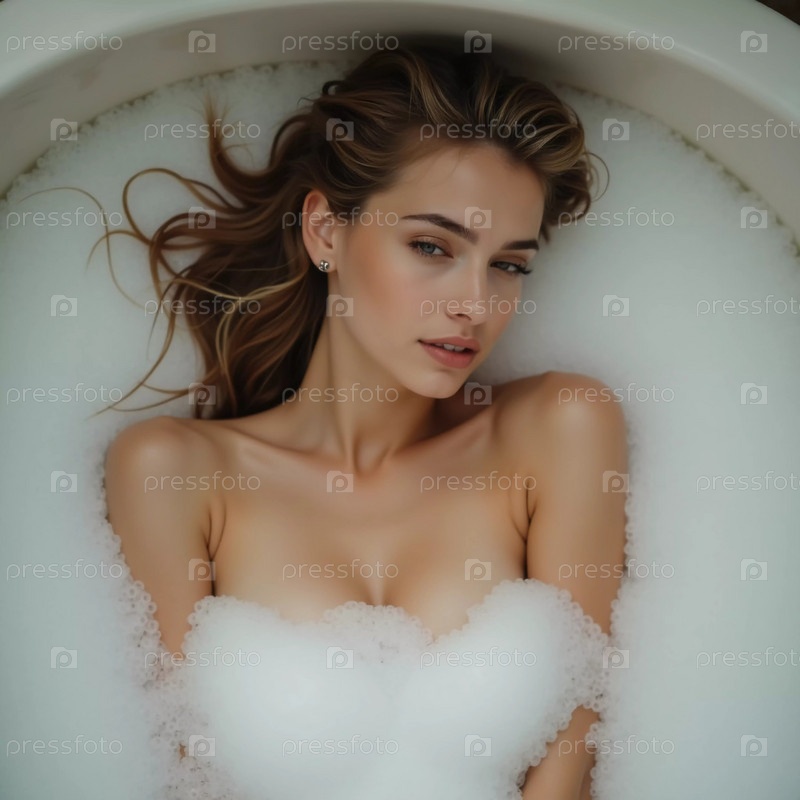 Молодая женщина с плавными волосами отдыхает в роскошной ванне, наполненной пушистой пеной, создавая спокойную атмосферу в хорошо освещенной ванной комнате во время спокойного дня