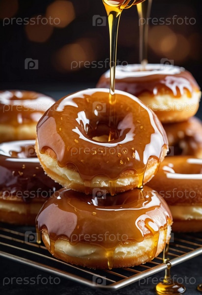 Пачка медовых глазурованных пончиков с глянцевым карамельным покрытием, украшенных хрустящими начинками, приглашая вас побаловать себя сладким угощением. Эти пончики идеально подходят для любого любителя десертов. Генерирующий ИИ
