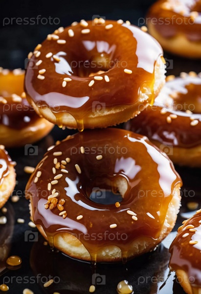 Пачка медовых глазурованных пончиков с глянцевым карамельным покрытием, украшенных хрустящими начинками, приглашая вас побаловать себя сладким угощением. Эти пончики идеально подходят для любого любителя десертов. Генерирующий ИИ