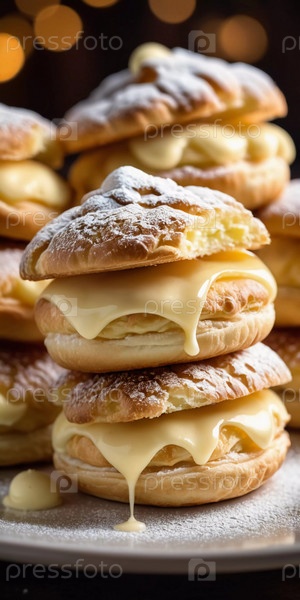 Тарелка свежеприготовленных пирожных, каждая из которых увенчана порошкообразным сахаром и кремовой начинкой, красиво устроена в мягком вечернем свете, приглашая любителей десерта побаловать себя
