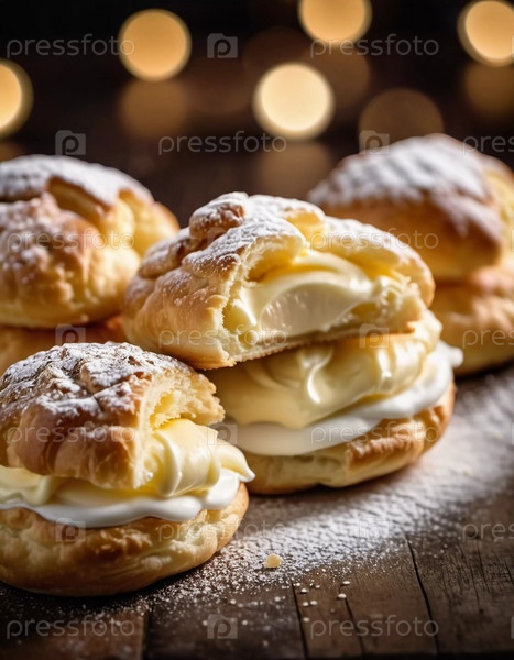 Тарелка свежеприготовленных пирожных, каждая из которых увенчана порошкообразным сахаром и кремовой начинкой, красиво устроена в мягком вечернем свете, приглашая любителей десерта побаловать себя. Генерирующий ИИ