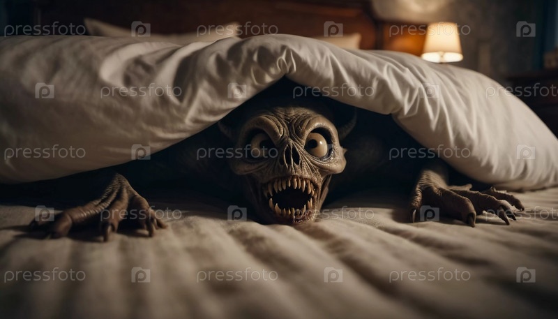Ужасающее кошмарное существо, скрывающееся под кроватью в тускло освещенной спальне, захватывает сущность страха и неизвестности ночью. Гротескное существо с привидениями тихо появляется из-под кровати. ИИ