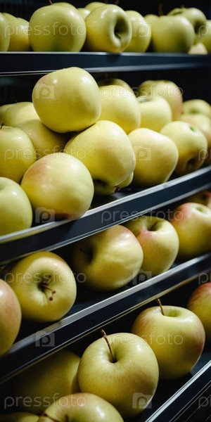 Красочный ассортимент желтых яблок аккуратно расположен на прилавке супермаркета, приглашая клиентов исследовать и выбирать свежие фрукты. Генеративный ИИ