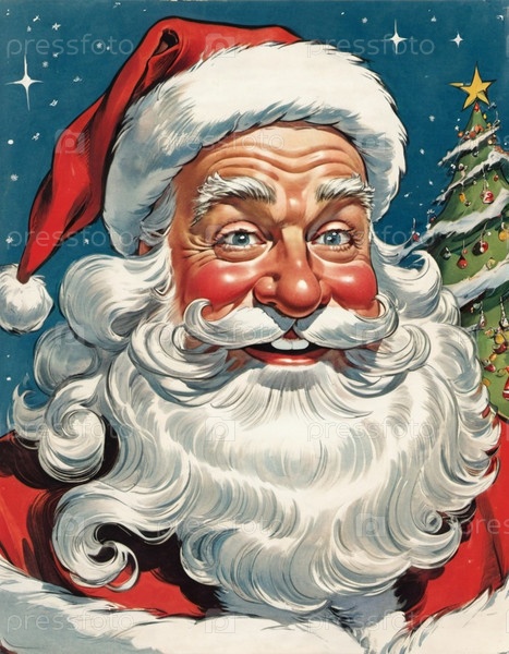 В этом классическом изображении Санта-Клаус носит традиционный красный костюм и шляпу, излучая радость сияющей улыбкой, прекрасно воплощая праздничный дух курортного сезона