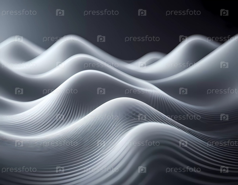 Плавучие 3D-волны в цветах черного и серого создают увлекательный абстрактный рисунок с гладкими кривыми и световым градиентом на темном фоне, который вызывает артистизм и спокойствие