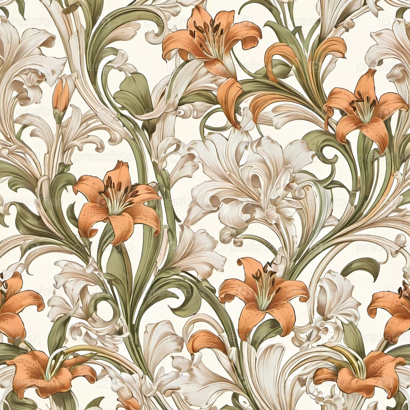 Красиво детализированные цветочные обои демонстрируют яркие оранжевые лилии и мягкие белые цветы, переплетенные с плавными зелеными листьями на кремовом фоне, создавая привлекательную атмосферу. Генерирующий ИИ