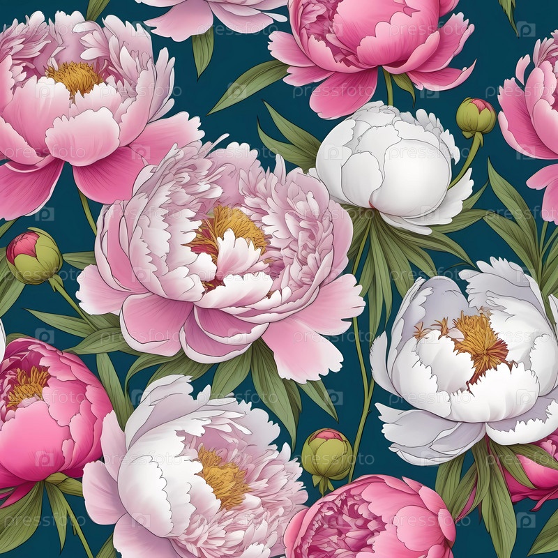 Яркий дизайн демонстрирует негабаритные розовые пионы, красиво расположенные на богатом военно-морском фоне, дополненные подробной зеленой листвой для потрясающего визуального эффекта. Художественный цветочный узор. Генерирующий ИИ