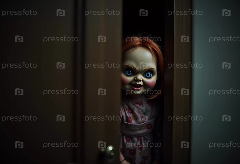 Кукла с пугающими чертами лица выглядывает из шкафа ночью, ее пронзительный взгляд и кривая улыбка создают леденящую атмосферу в тускло освещенной комнате. Страшная кукла для ужаса. Генеративный ИИ