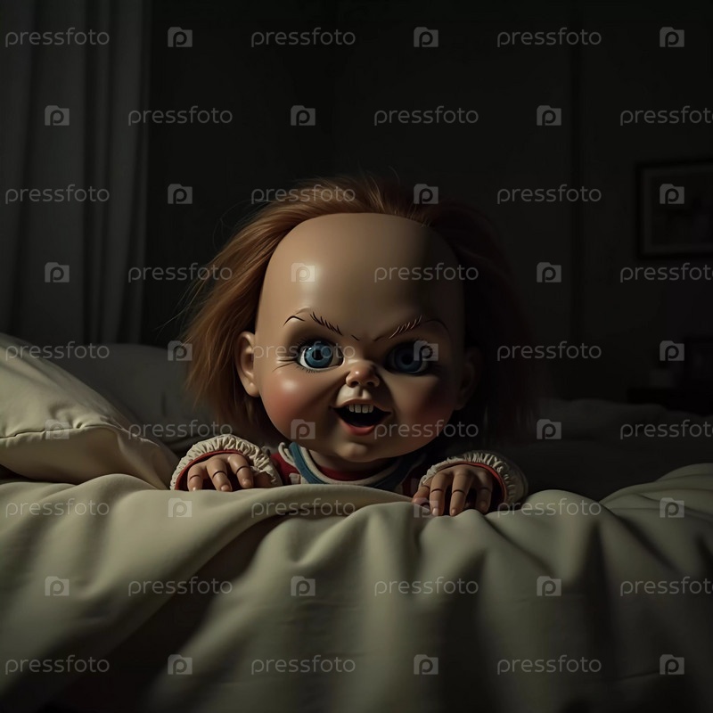 Кукла с преследующими чертами скрывается под кроватью, ее пронзительный взгляд и искривленная улыбка создают леденящую атмосферу в тускло освещенной комнате. Страшная кукла для ужасов и Хэллоуина. Генеративный ИИ