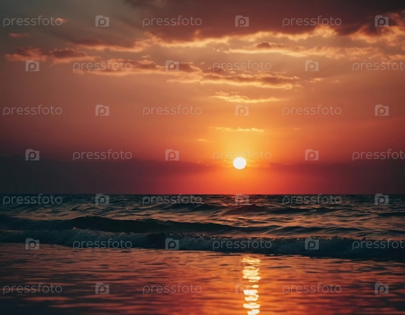 Потрясающий восход солнца купает океан в ярком красном свете, поскольку облака отражают цвета выше. Волны мягко обходят берег, создавая мирную атмосферу на рассвете. Влажность дымится над водой. Генерирующий ИИ