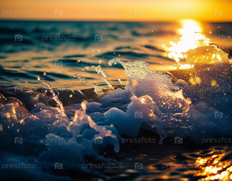 Когда солнце садится, морские волны падают на берег, создавая красивый всплеск. Небо окрашено теплыми цветами, отражающимися на поверхности океана. Морской природный ландшафт. Генерирующий ИИ