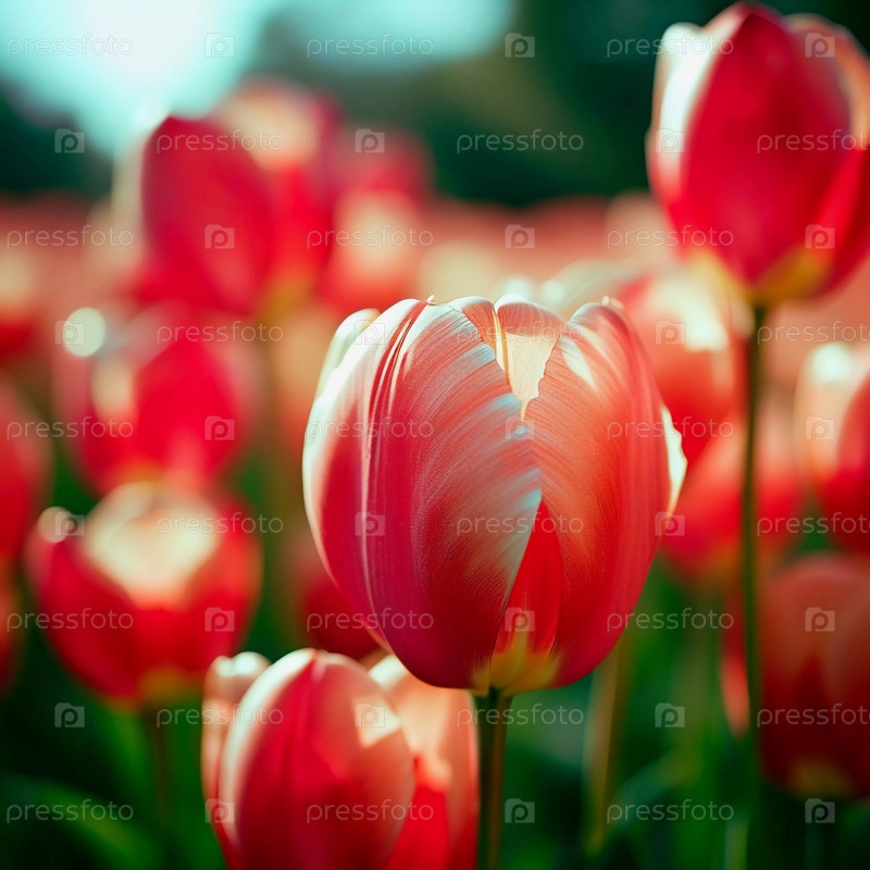 Поле тюльпанов греется в золотом солнечном свете сумерек, демонстрируя яркие оттенки белого и красного, когда цветы широко открываются. Сцена отражает суть весенней красоты. Генеративный ИИ