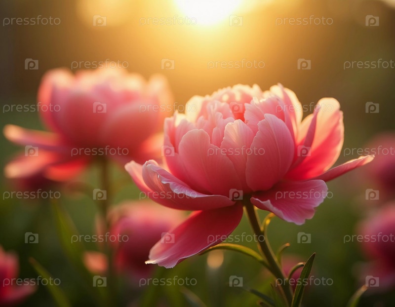 Яркий пион цветет в оттенках розового, стоит высоко, когда золотое солнце садится на заднем плане, создавая безмятежный и атмосферный пейзаж, наполненный теплом. Генеративный ИИ