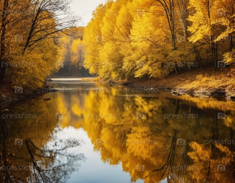 Яркие желтые листья создают потрясающий осенний дисплей вокруг спокойного озера, с отражениями, отражающими листву на поверхности воды, когда день подходит к концу. Генерирующий ИИ