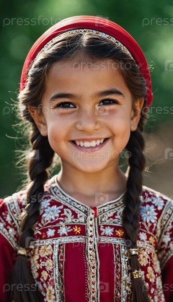 Молодая улыбающаяся девушка 5 лет таджикской национальности стоит на улице, одетая в традиционную одежду. генерируемый