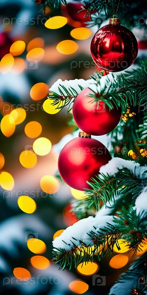 Красочные рождественские украшения украшают ветви елки, яркие шары в оттенках красного и розового, олицетворяющие праздничное настроение зимой. С Новым годом искусство боке фон. Генеративный ИИ
