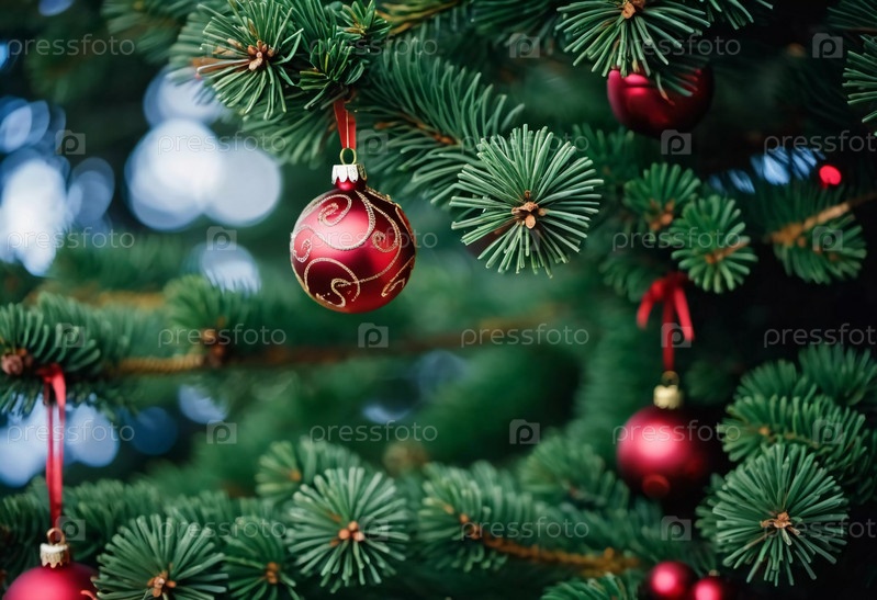 Красочные рождественские украшения украшают ветви елки, яркие шары в оттенках красного и розового, олицетворяющие праздничное настроение зимой. С Новым годом искусство боке фон. Генеративный ИИ