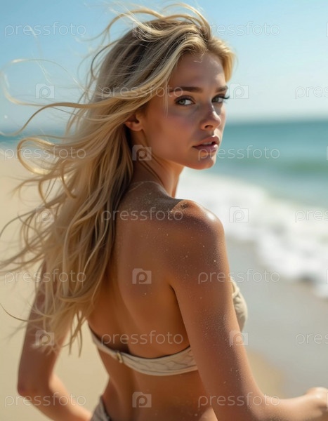 Блондинка в купальнике смотрит назад, стоя у береговой линии. Нежные морские волны лазают у ее ног под ясным голубым небом. Длинные волосы, красивое молодое лицо. Реклама путешествий и одежды. ИИ