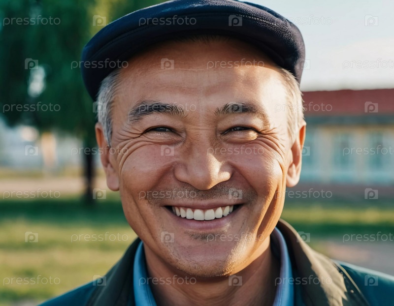 Мужчина 50 лет с искренней улыбкой стоит на улице в оживленном районе, демонстрируя дружелюбное поведение и наслаждаясь прекрасным днем среди яркой обстановки. Житель Казахстана. генерируемый