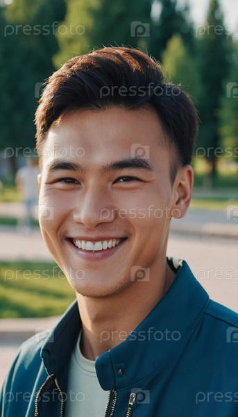 Молодой человек 25 лет с яркой улыбкой стоит на улице, в окружении оживленной деятельности. Житель Казахстана, милый мужчина 25 лет. Взрослый человек, уверенный в своих силах. генерируемый