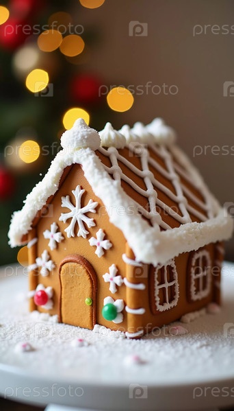 Очаровательный пряничный дом со снежной крышей сидит на тарелке, окруженный праздничными украшениями, захватывая дух праздника. Белый сладкий сливочный крем. Новый год, рождественское украшение. Генерирующий ИИ