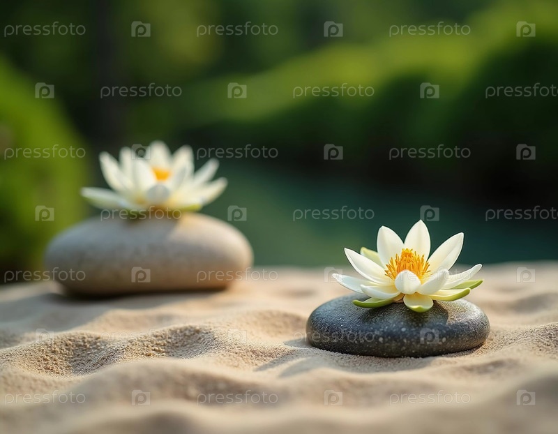 Гладкие камни тщательно сложены рядом с нежной белой лилией в спокойной обстановке сада. Мягкий солнечный свет фильтрует зелень, усиливая мирную атмосферу. Генерирующий ИИ