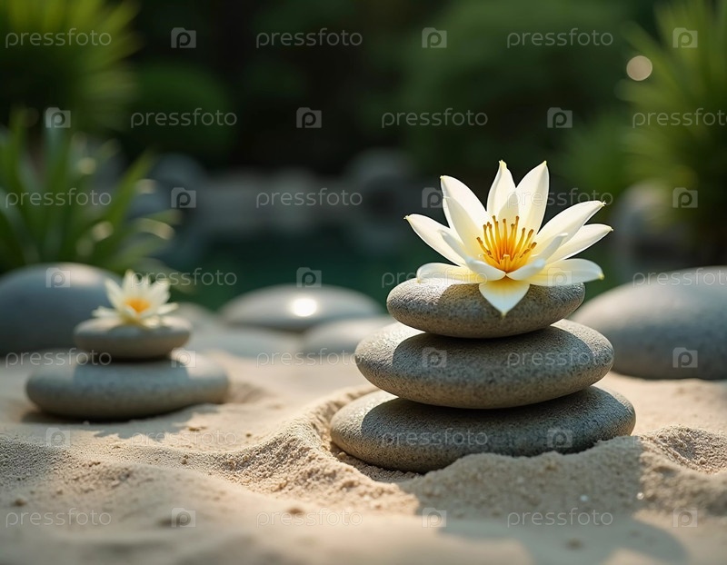 Гладкие камни тщательно сложены рядом с нежной белой лилией в спокойной обстановке сада. Мягкий солнечный свет фильтрует зелень, усиливая мирную атмосферу. Генерирующий ИИ