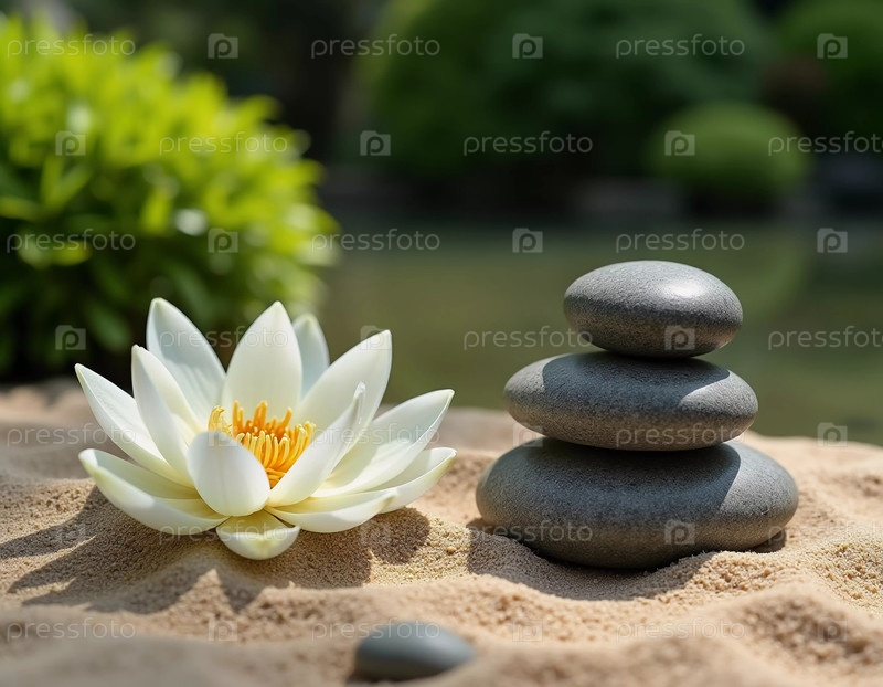 Гладкие камни тщательно сложены рядом с нежной белой лилией в спокойной обстановке сада. Мягкий солнечный свет фильтрует зелень, усиливая мирную атмосферу. Генерирующий ИИ