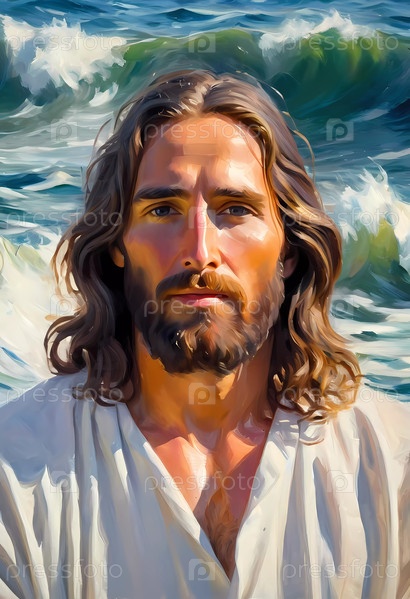 Христос на волнах. Портрет мужчины, одетого как Иисус. Белый халат. Длинные каштановые волосы и борода. Человеку, по-видимому, около 30 лет, и у него серьезное выражение лица. Христианская религия и вера. ИИ