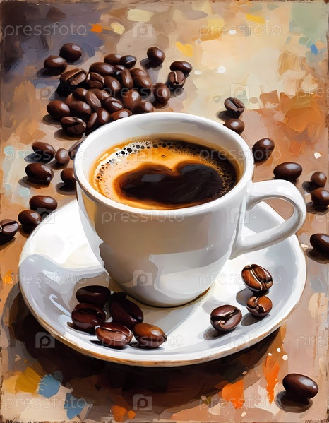 Теплый кофе эспрессо подается в очаровательной белой чашке с дизайном сердца на тарелке кофейных зерен на старинном деревянном столе в уютной атмосфере. Ретро нарисовал стилизованную картину. Генерирующий ИИ