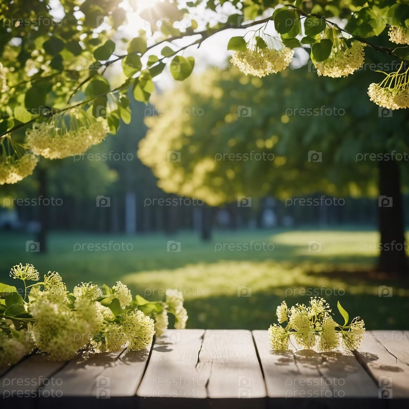 Солнечный свет течет через ветви деревьев в парке, освещая тропу, облицованную пышной зеленой и цветущими цветами, создавая тихую атмосферу