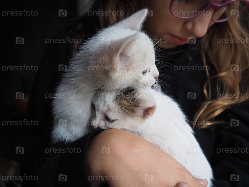 Белый котенок радостно взаимодействует руками ребенка, демонстрируя игривое поведение. Уютная обстановка в помещении усиливает тепло этого восхитительного момента, наполненного смехом и весельем. Две кошки