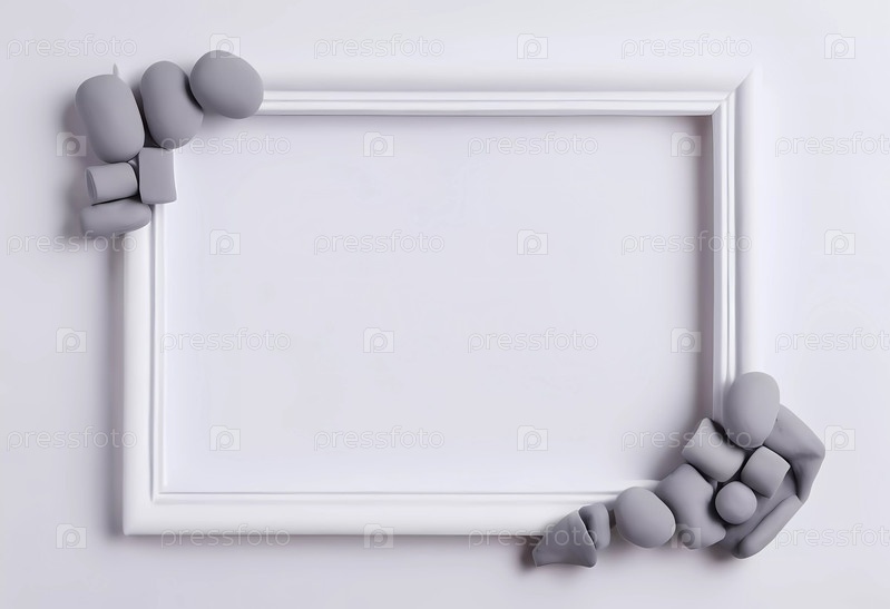 Пустая прямоугольная рама сидит на бело-сером абстрактном фоне, усиленном гладкими серыми формами, расположенными в углах, приглашая творчество и художественные мысли