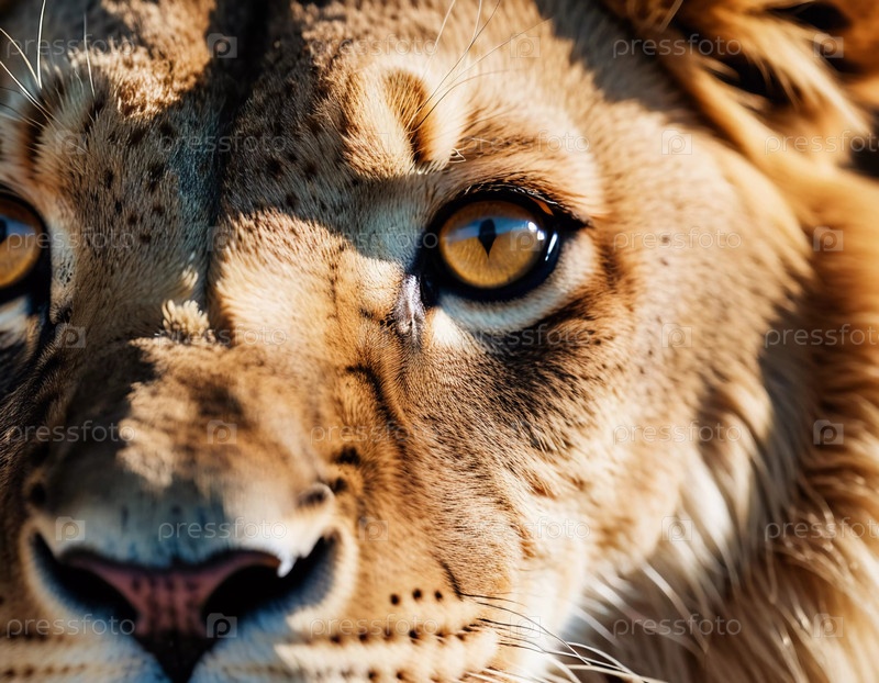 Глаза льва показывают яркий янтарный цвет и мощное выражение. Животное спокойно, но бдительно, воплощая свою дикую природу среди зелени. Детальный мех и яростный взгляд в естественной среде обитания. Генеративный ИИ