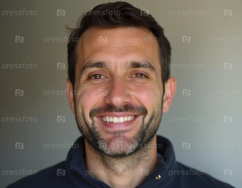 Веселый молодой симпатичный мужчина 30 лет, житель США, с короткими волосами и ухоженной бородой тепло улыбается во время ношения повседневной одежды. Мягкое освещение улучшает дружественную атмосферу. Генерирующий ИИ