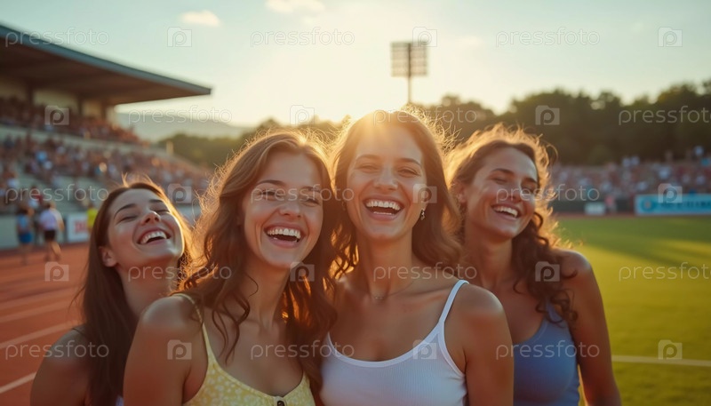 Группа из четырех друзей радостно делится смехом и товариществом на шумном спортивном стадионе. Солнце садится за ними, создавая теплую, веселую атмосферу, которая захватывает их счастье