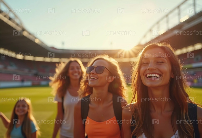 Группа друзей наслаждается радостным моментом на спортивном стадионе, наполненном смехом и солнцем. Их лица сияют счастьем, когда они делятся незабываемыми воспоминаниями