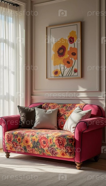 Пышные цветочные принты украшают ярко-красный диван в красиво освещенной комнате. Солнечный свет фильтрует через чистые шторы, отбрасывая мягкие тени, усиливая теплую атмосферу приглашающего пространства