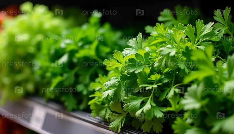 Яркая петрушка и хрустящий сельдерей выстраиваются на полках шумного супермаркета. Покупатели просматривают свежие продукты, вдохновленные на создание здоровых блюд с использованием этих ароматных трав и овощей