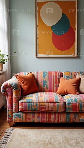 Яркая красная крышка дивана приносит жизнь в гостиную в сочетании с красочными подушками и современными произведениями искусства. Солнечный свет фильтруется через шторы, создавая теплую атмосферу