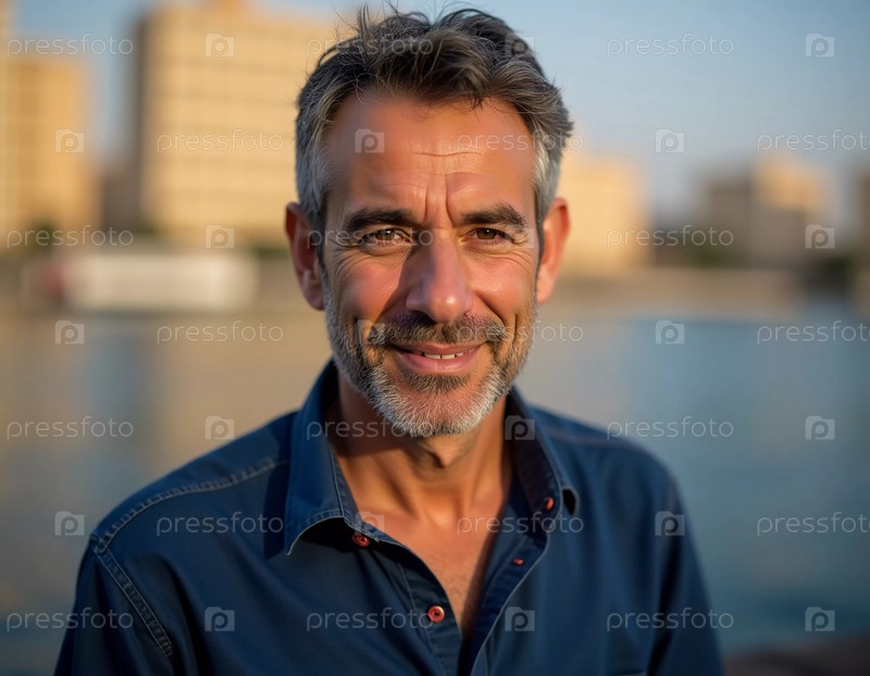 Дружелюбный житель Израиля наслаждается спокойным моментом у воды, когда заходит солнце. Его улыбка отражает тепло вечера, окруженного горизонтом города