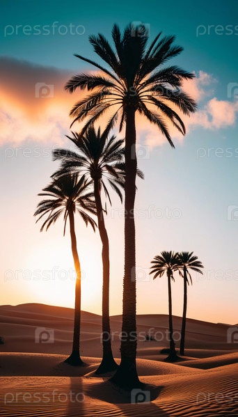Под захватывающим закатом гордо стоят высокие пальмы, их силуэты очерчены на фоне красочного неба, отбрасывая длинные тени над теплыми песками пустыни Генеративный ИИ