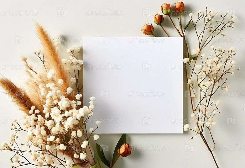 Красивая открытка отдыхает среди очаровательных гипсофилов и мягко закрытых роз, вызывая безмятежную и художественную атмосферу, идеально подходящую для творческого самовыражения