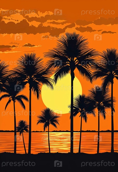 Когда день прощается, пальмы стоят высоко против сияющего заката, отбрасывая тени на спокойные воды, создавая волшебную атмосферу безмятежности и красоты