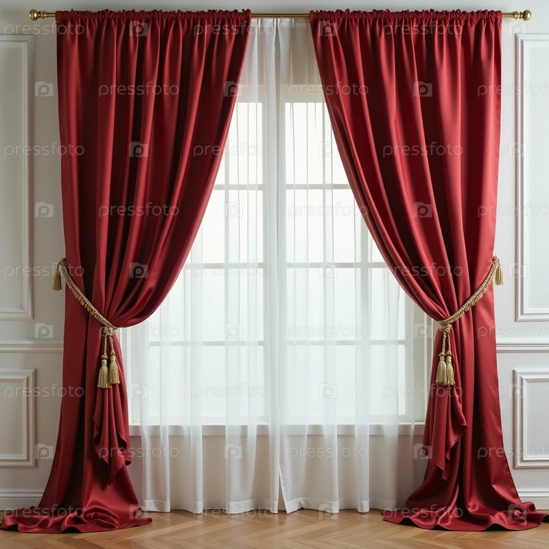 Богатые шелковые занавески изящно каскадируют, обрамляя окно в со вкусом оформленной комнате. Глубокий красный цвет усиливает атмосферу, приглашая естественный свет фильтроваться через генеративный ИИ
