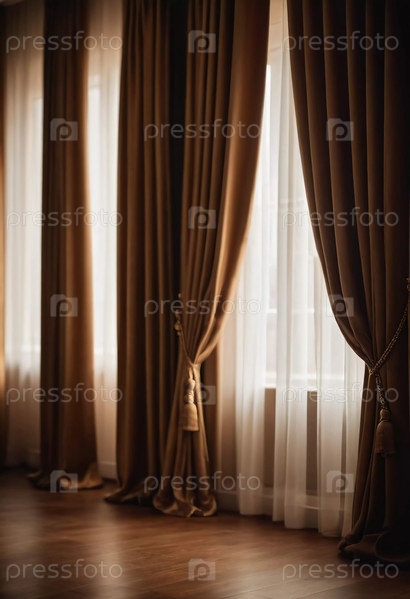 Роскошные шелковые шторы элегантно каскадируют из высоких окон, фильтруя мягкий солнечный свет в безмятежную комнату, украшенную деревянными полами и нежными оттенками